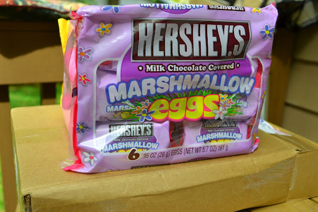 I chose the later option, obviously. My kids like so many different kinds of candy that it just seemed like the best option. Per basket, I used 2 boxes of Peeps (in 2 different colors), 1 pack Snickers Eggs, & 1 pack Hershey's Marshmallow Eggs. The Hershey's were a little taller than the rest, but I like that because I am planning on putting a couple goodies - like small stuffed bunnies, stickers, & pencils in the back & I like that they have something to lean back against.